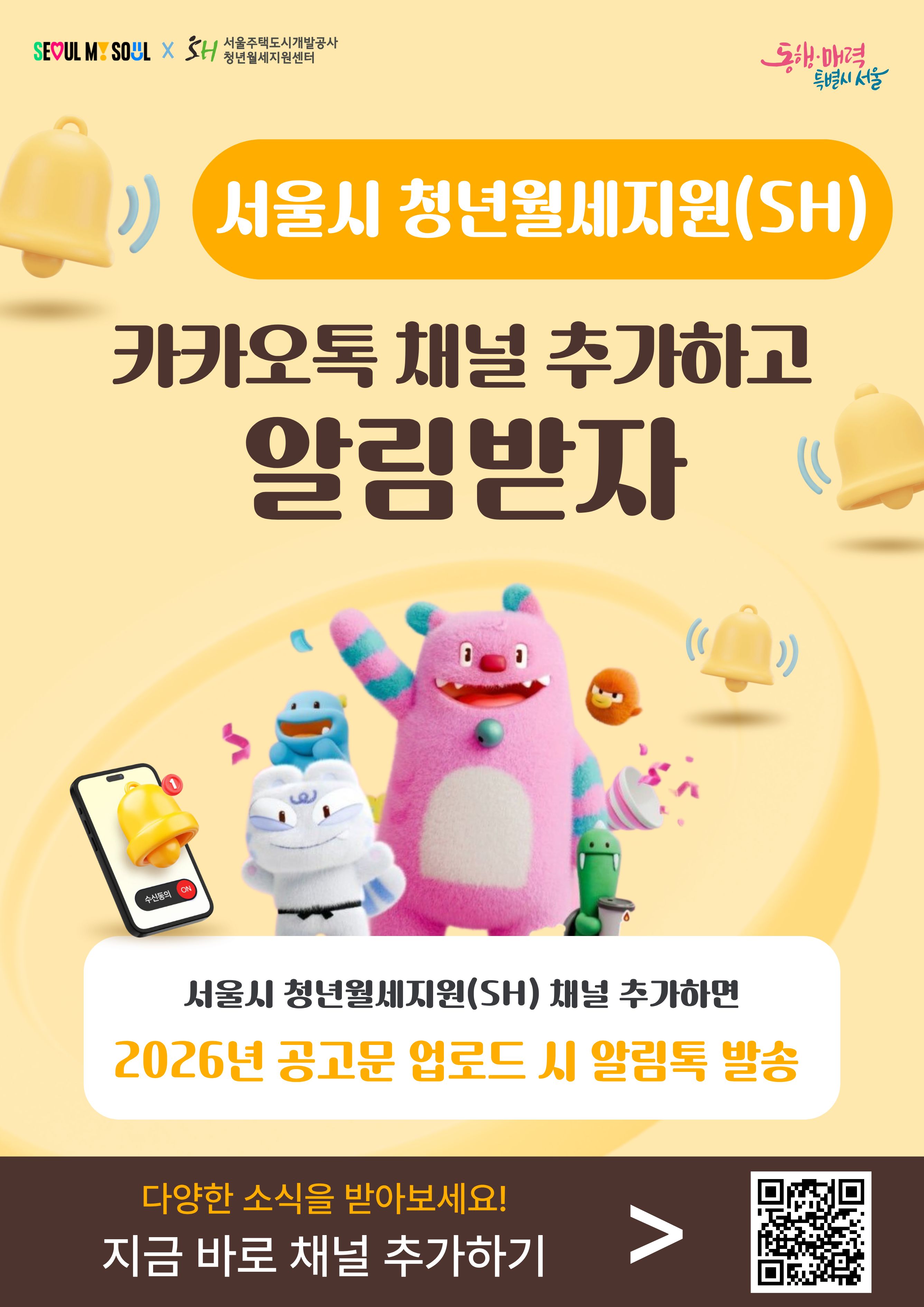 이미지 하단 QR코드 스캔 또는 카카오톡에서 ‘서울시 청년월세지원(SH)’ 검색 후 채널 추가